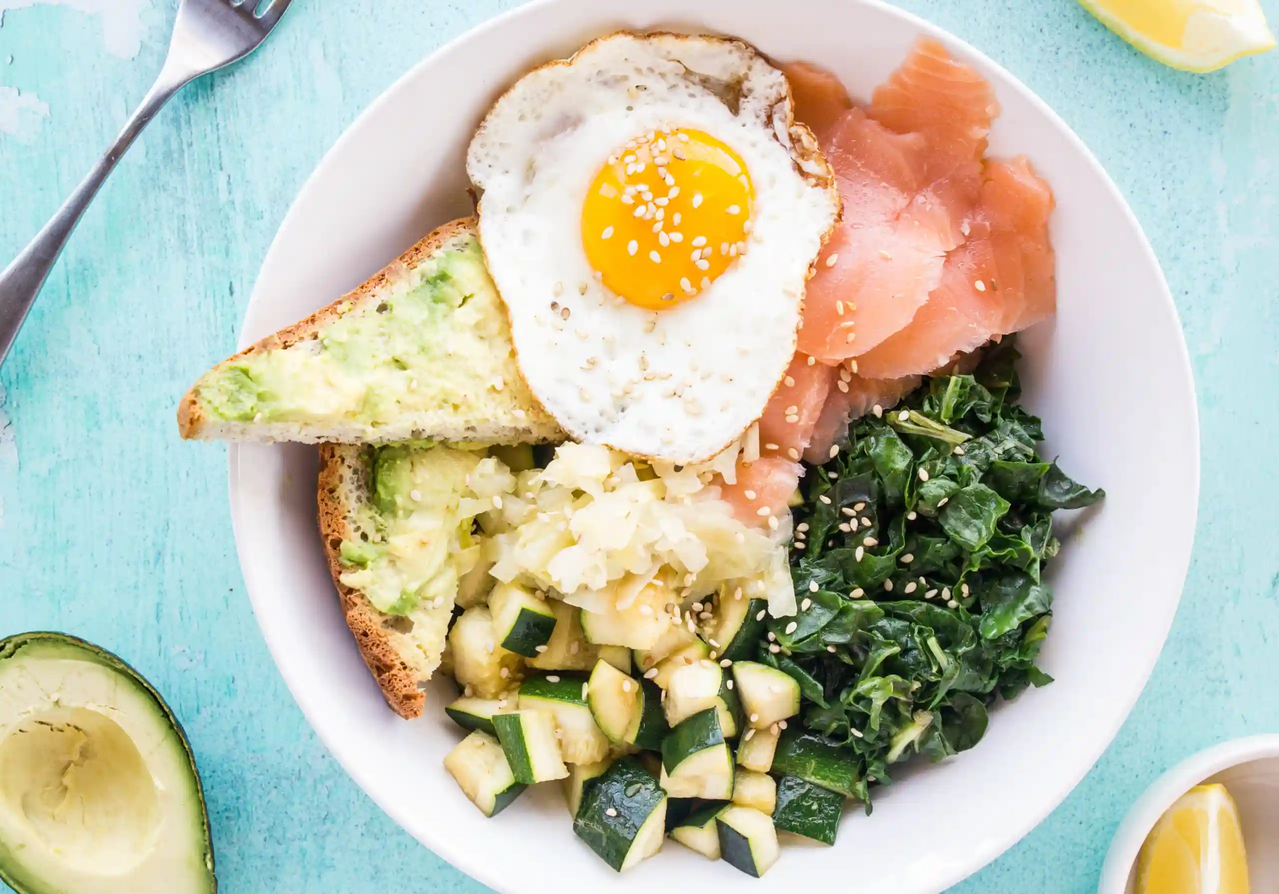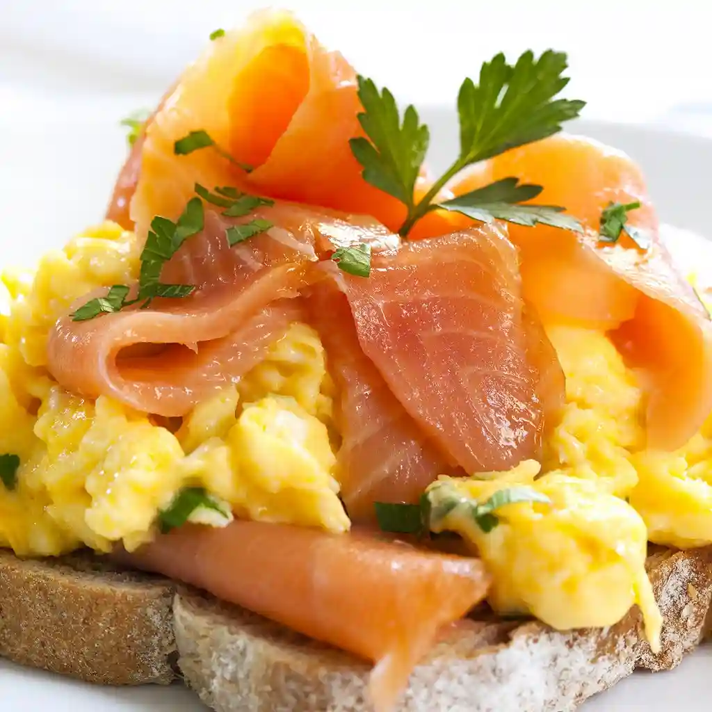 Two Fried or Scrambled Eggs, Bacon or Homemade Smoked Salmon, Served with Wilted Baby Spinach and Plantain Banana. Pa...