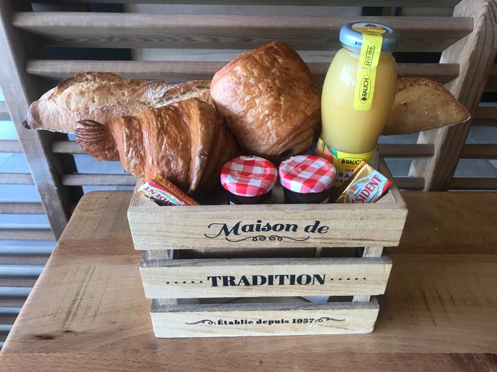 1/2 Baguette, 1 Croissant, 1 Pain Chocolat, 2 Butters, 2 Jams, 1 Juice