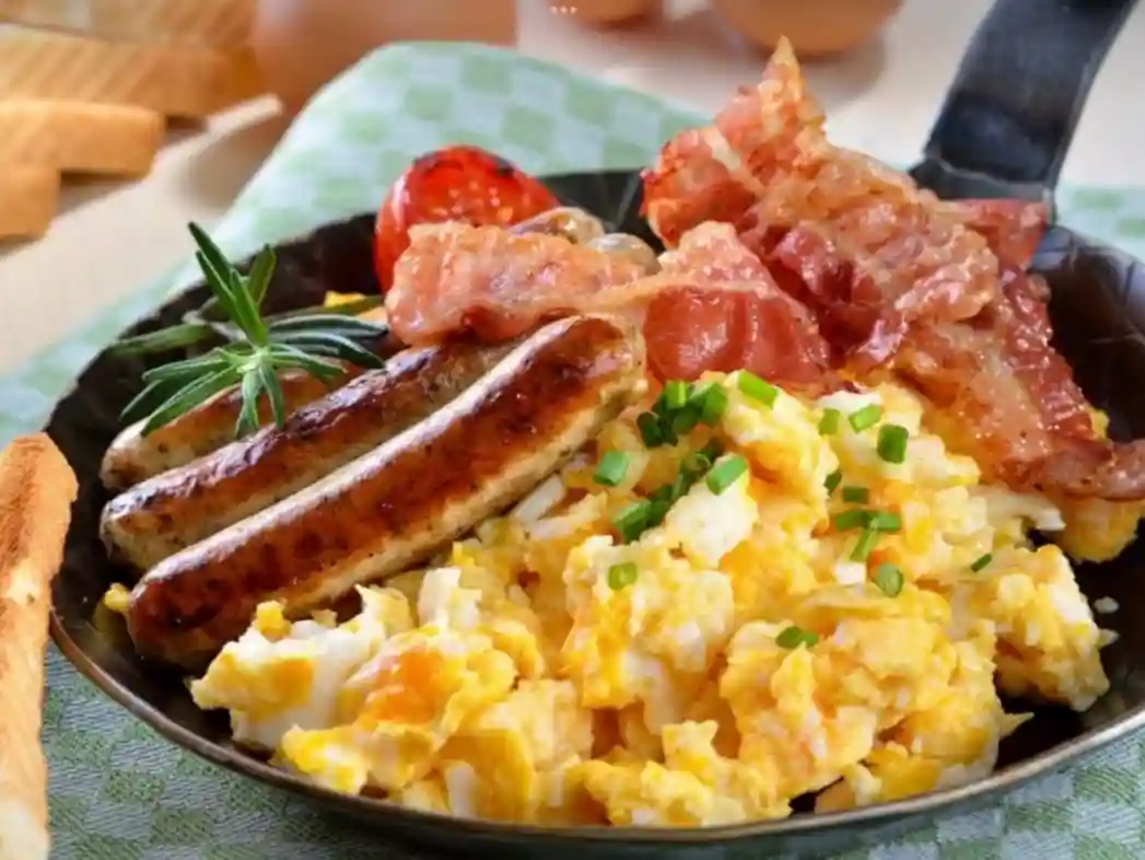 Scrambled eggs, Bacon, Sausage, Potat...