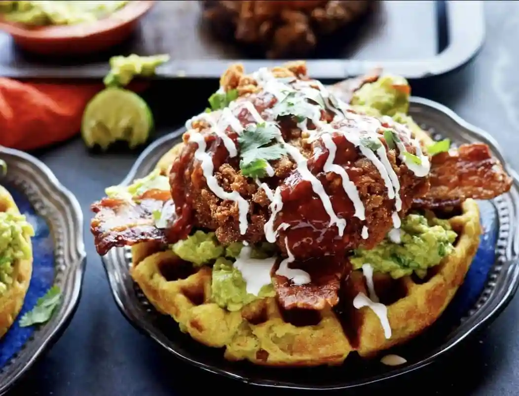Fried Chicken waffle, Avocado, Chedda...