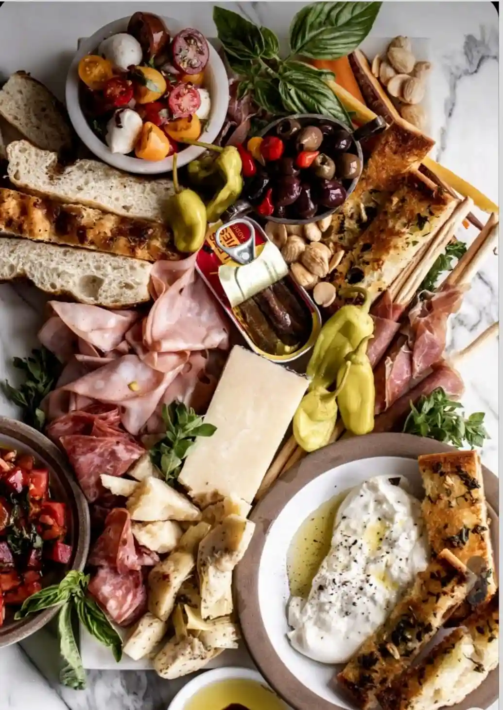 Assortment of cheeses, Charcuterie, Dips, Tapas, Condiments, Bread & Crackers