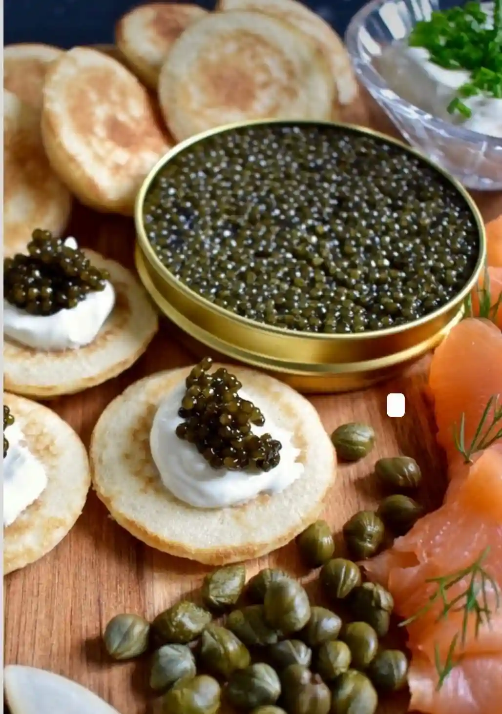 Caviar, Foie gras, Truffle Brie, Truffle ham, Smoked salmon, Dips, Condiments, Blinis & Crakers
