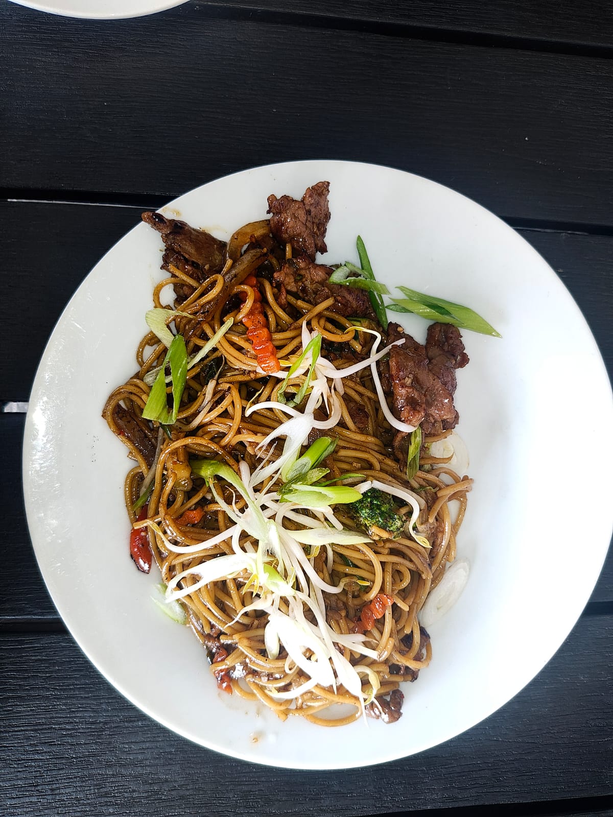 On Jasmine Rice, Sliced Beef Sautéed with Cherry Tomatoes, Flowered Chives, Onions, Fried Egg