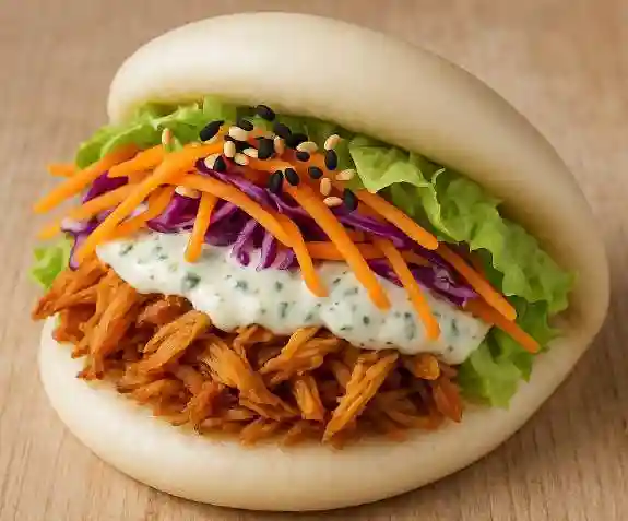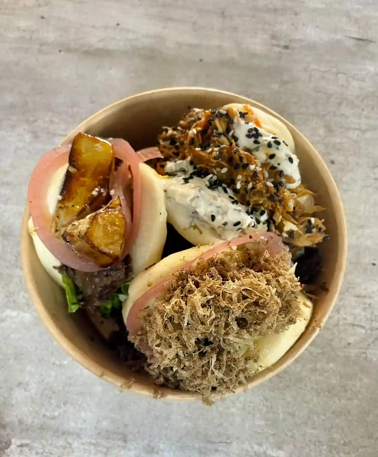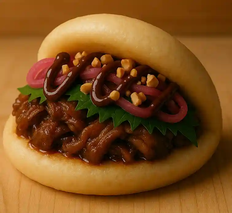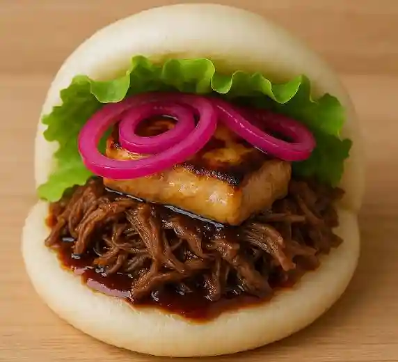 Porc braisé, Shiso Sauce, Hoisin Cacahuètes, Pickled oignons.