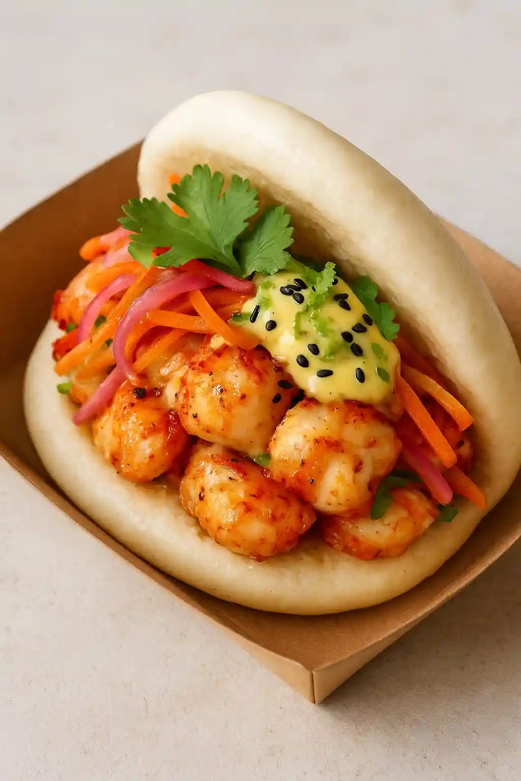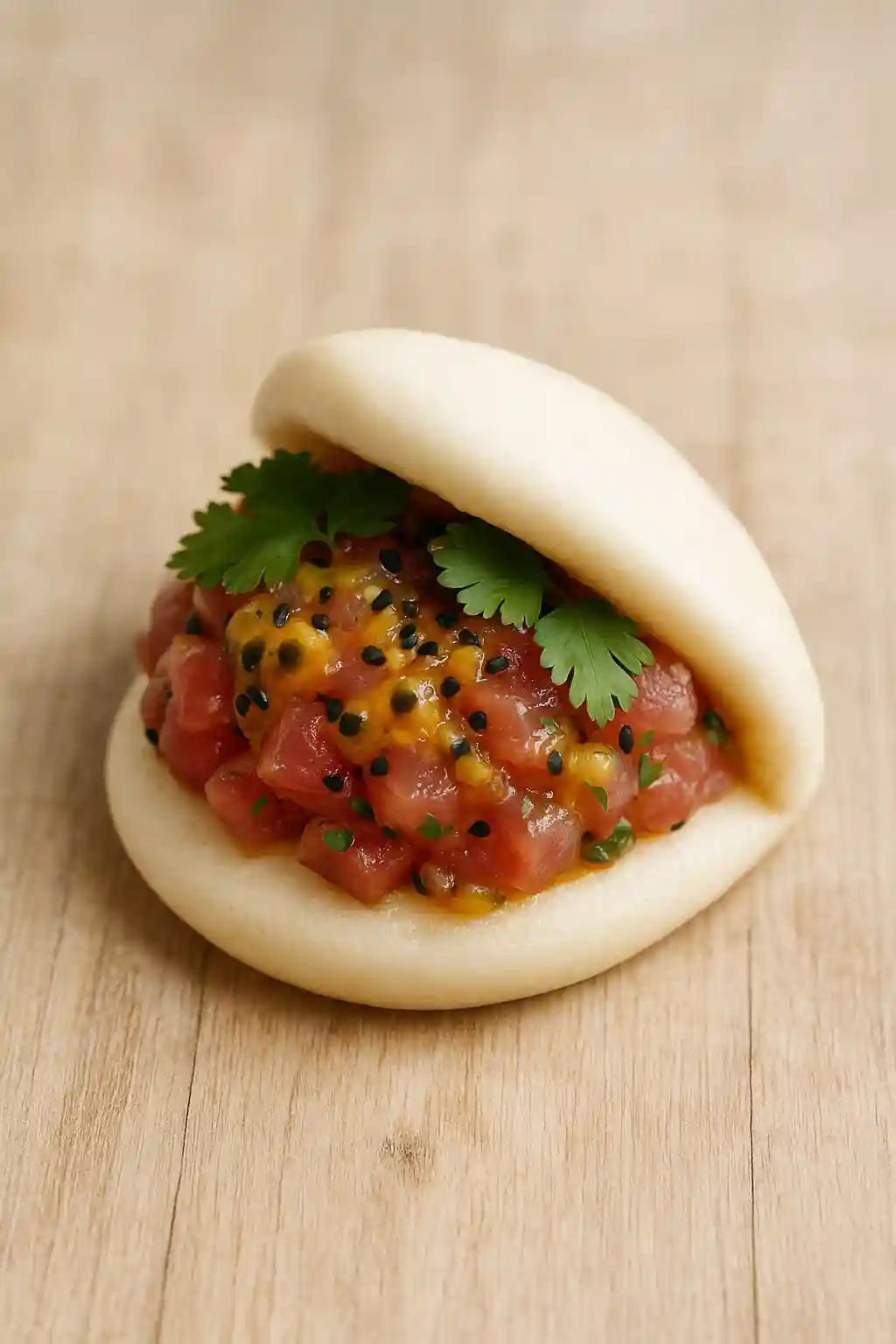 3 Bao Boeuf teriyaki maison au foie gras poêlé , 3 Bao Tartare de thon passion, 3 Bao Langouste rôti sauce yuzu