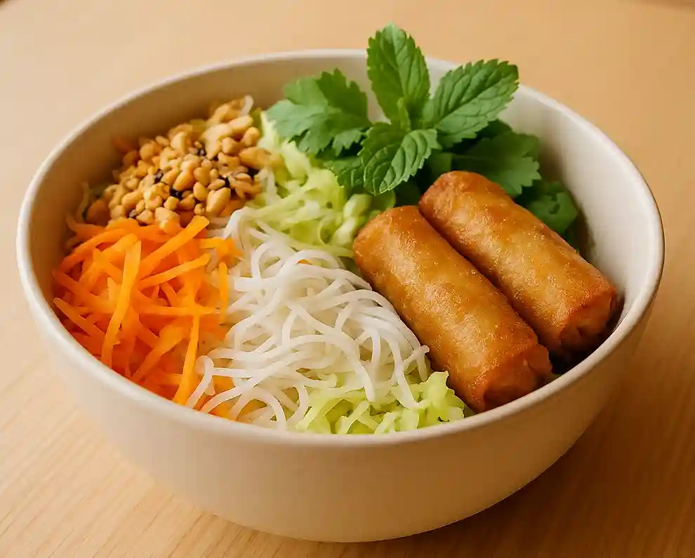 Vermicelle de riz, Carotte, Concombre, Nems, Menthe, Coriandre, Cacahuète, Vinaigrette aux piments de mangue