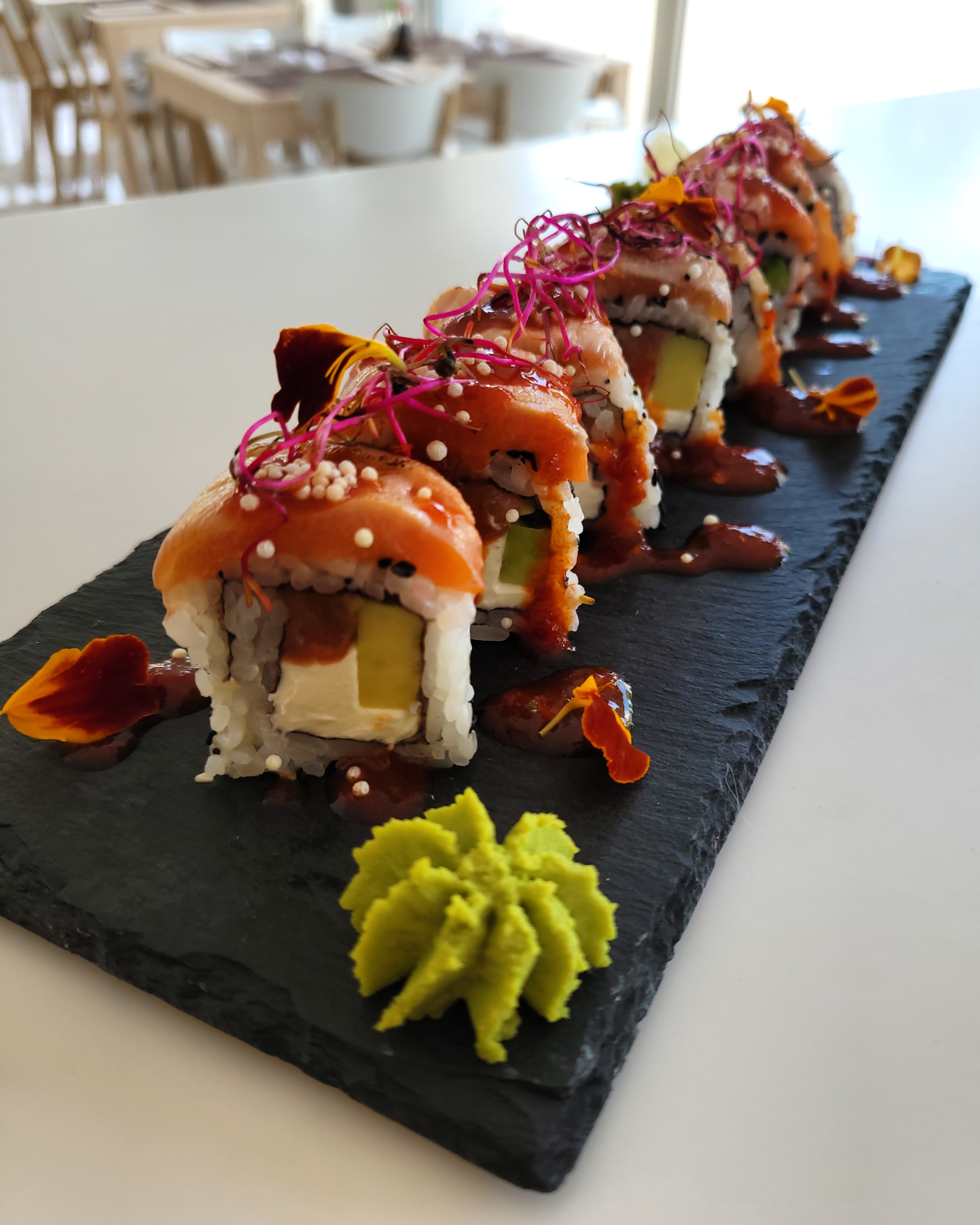 8 California Saumon Avocat, 8 Spring Saumon Avocat, 6 Nigiri Saumon, 2 Yakitori Boeuf Cheese